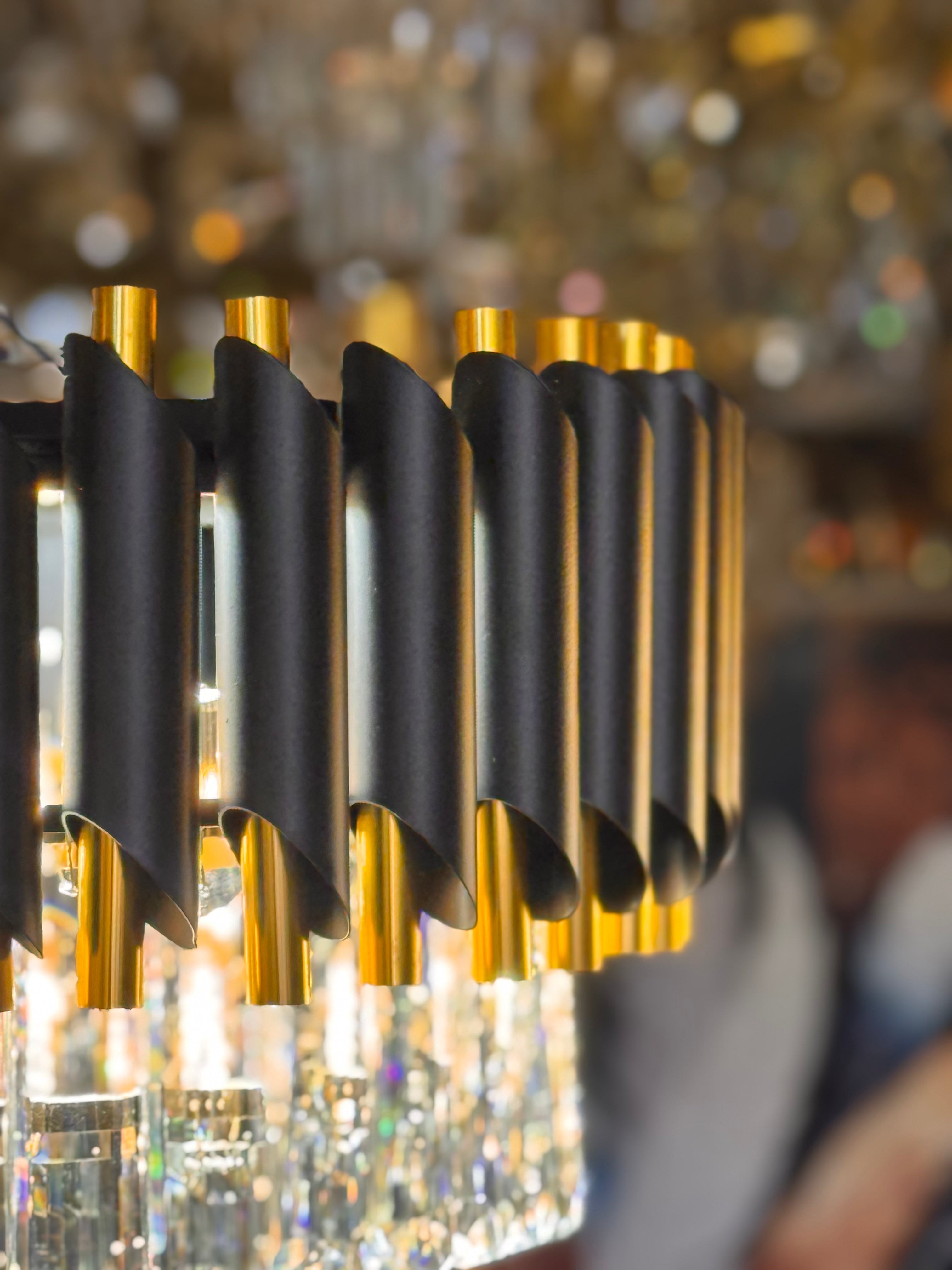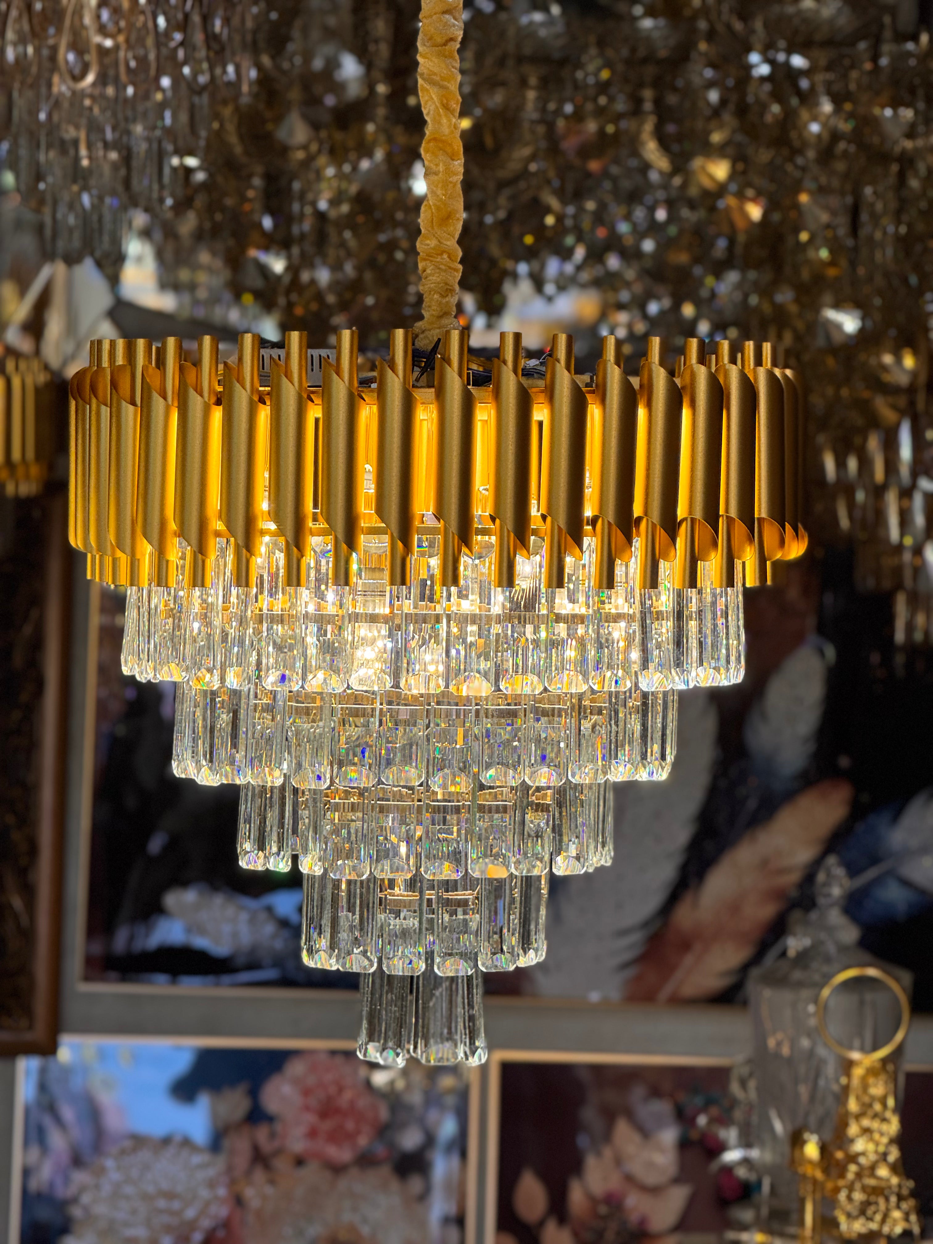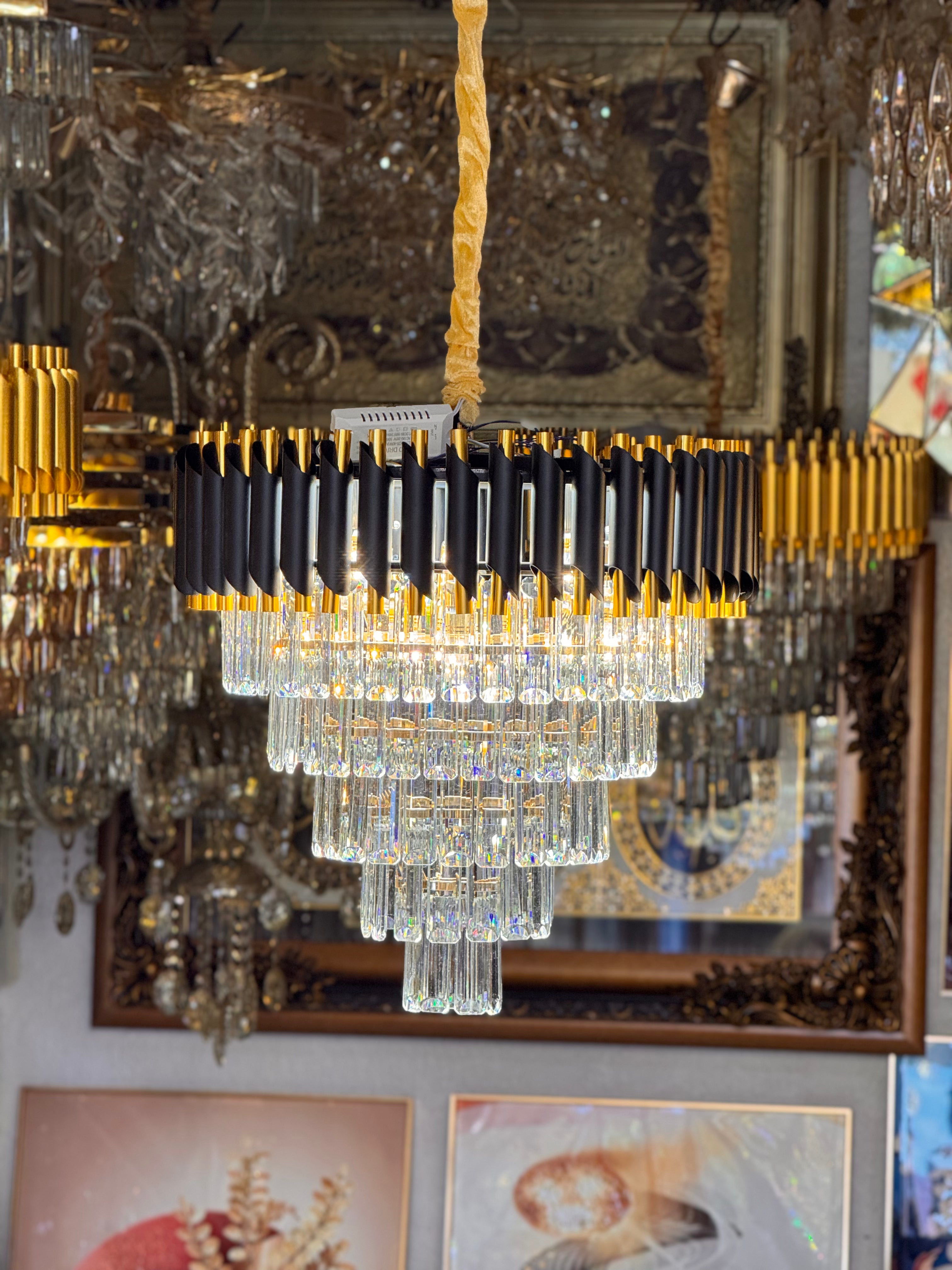 ثريا فاخرة بقطر 50 سم مصنوعة من الألمنيوم عالي الجودة مع كريستال لامع بتصميم راقي. تتكون من 5 طبقات من الكريستال التي تعكس الضوء بشكل أنيق وتمنح المكان لمسة فخامة حقيقية